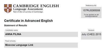 Вот так выглядит уведомление о сдаче Кембриджского экзамена.