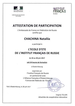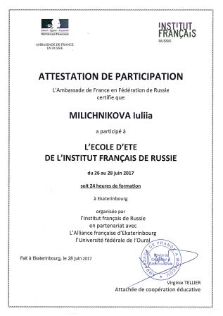 С 26 по 28 июня в Екатеринбурге прошла Летняя школа учителей французского языка. Это мероприятие проводилось Французским Институтом в России при поддержке посольства Франции и Уральского Федерального Университета. Преподавателям из более чем тридцати городов России были предложены различные педагогические, методические рекомендации для дальнейшего совершенствования преподавания французского языка. Носители языка организовали мастер-классы, совместную проектную деятельность, что позволило педагогам погрузиться в языковую среду и получить не только новые знания, но и море положительных эмоций и желание применить полученные знания на практике. Наши учителя Миличникова Юлия Михайловна и Чачина Наталия Валериевна приняли участие в этом мероприятии. Мотивация учащихся к изучению французского языка на начальном этапе обучения, мотивация к углубленному изучению французского языка и к участию в различных конкурсах и олимпиадах, творческий подход к подаче языкового материала и использование современных французских методик и технологий – вот основные направления модулей, в которых приняли участие наши коллеги.
