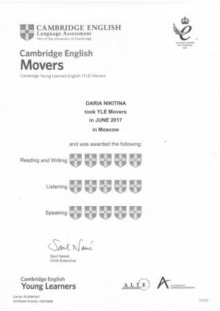 Никитина Даша, ученица 2 класса, успешно - на одни пятерки - сдала Кембриджский экзамен YLE Movers.