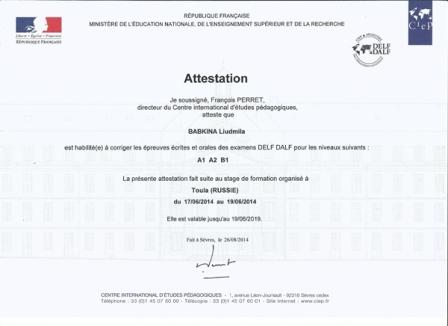 Поздравляем Бабкину Людмилу Геннадьевну, которая прошла обучение в международном сертификационном центре и получила сертификат эксперта международных экзаменов по французскому языку! Молодец!